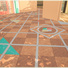 Beneden kom je direct in de kantoorruimte binnen. Aan de linkerzijde is de keuken met eetgedeelte, en een trap naar boven. Achterin is de woonkamer. In de woonkamer is ook nog een klein badkamertje met toilet. Vanuit de woonkamer kun je naar buiten. Buiten heb ik een speelse vloer gecreëerd. En ik heb een kleine kas gemaakt. Je kunt die ruimte gebruiken voor planten of wat je maar wilt.